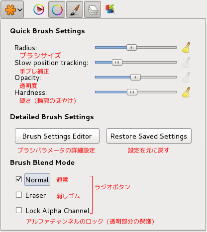 この機能は一時的にブラシの設定を変更するツールで、ツールバー上の「ブラシ設定」をクリックする事で行う。